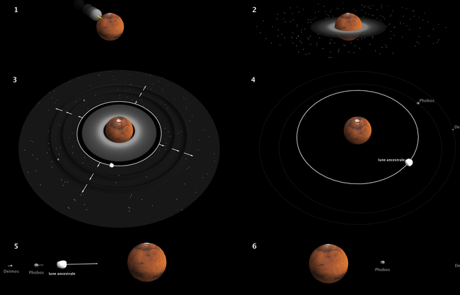 On cooling, and under the effect of gravity, this gas would be turned into tiny dust grains measuring several tens of nanometers. Gradually, these grains are agglomerated to form a dozen small satellites and a huge moon. The latter would be settled on Mars under the effects of the attraction of the planet. In the end, only subsisted Phobos and Deimos, remote enough to withstand that force.